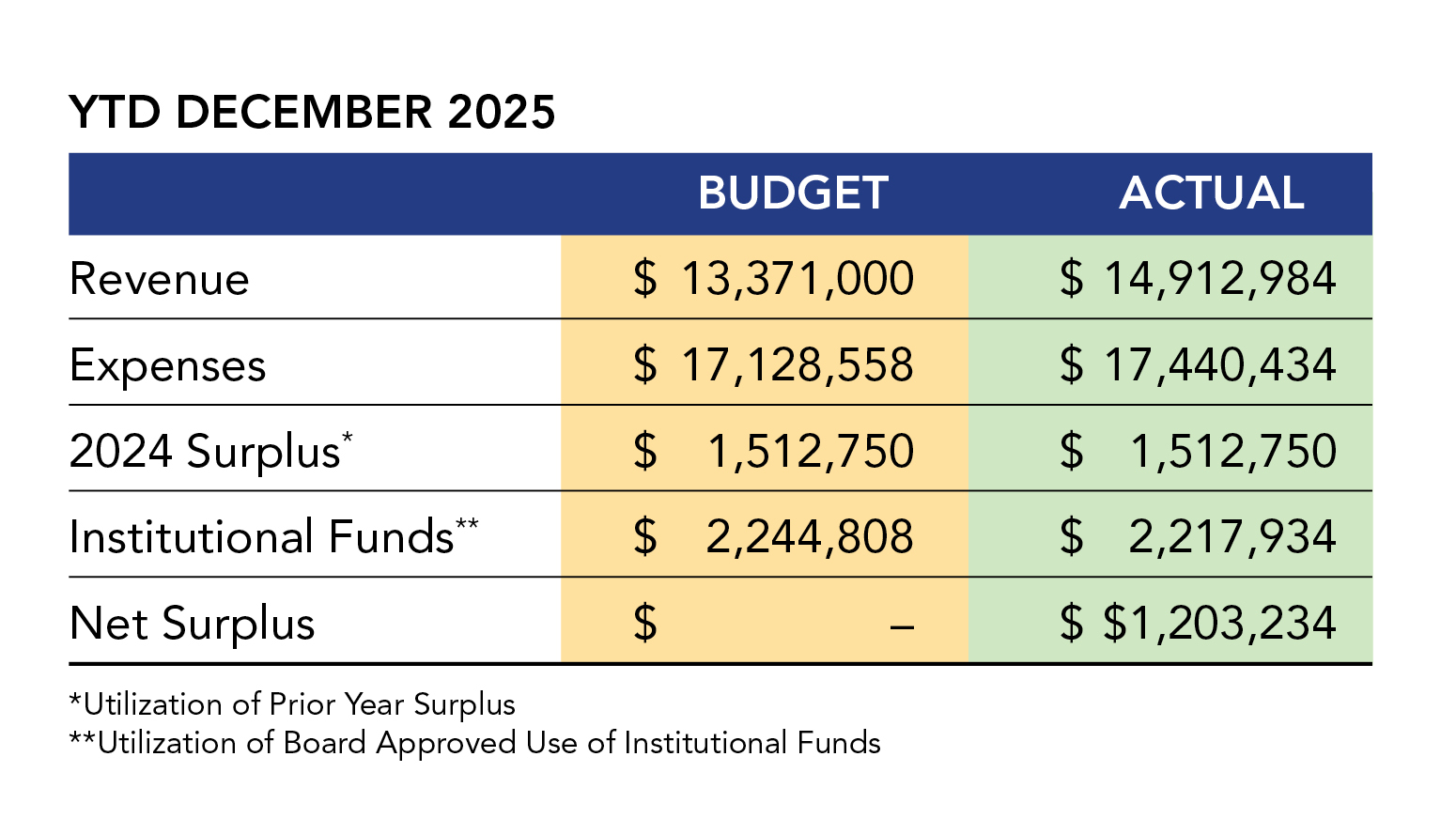 We are deeply grateful for the congregation’s extraordinary response to give Above + Beyond! Total revenue for the year reached $14,912,984, exceeding the budgeted $13,371,000. Revenue consisted of both donations and fees, with fee income coming in approximately at budget. Donations totaled $14,063,731 compared to a budget of $12,540,000—an excess of $1,523,731 that far surpassed the $600,000 Above + Beyond goal. Operating expenses totaled $17,440,434, which was $311,876 over budget, primarily due to expanded programming and increased operational costs related to growth and inflation. After applying the budgeted Prior Year Surplus and Institutional Funds, we closed the year with a net surplus of $1,203,234. We look forward to telling you about how God is furthering the kingdom work of the 60 churches and ministries that received the $600,000 and to hearing how His Spirit continues to move your heart and giving to share the Gospel.